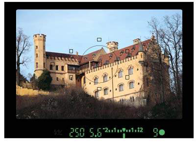 В центральной части находятся точки автофокусировки. Вы можете выбрать любую точку, на которой камера сфокусируется автоматически. Внизу видоискателя показана информация о съемке. Через окуляр видоискателя можно четче, чем на ЖК-дисплее компактной фотокамеры, увидеть детали предмета, цвет, выражение лица и т.д.